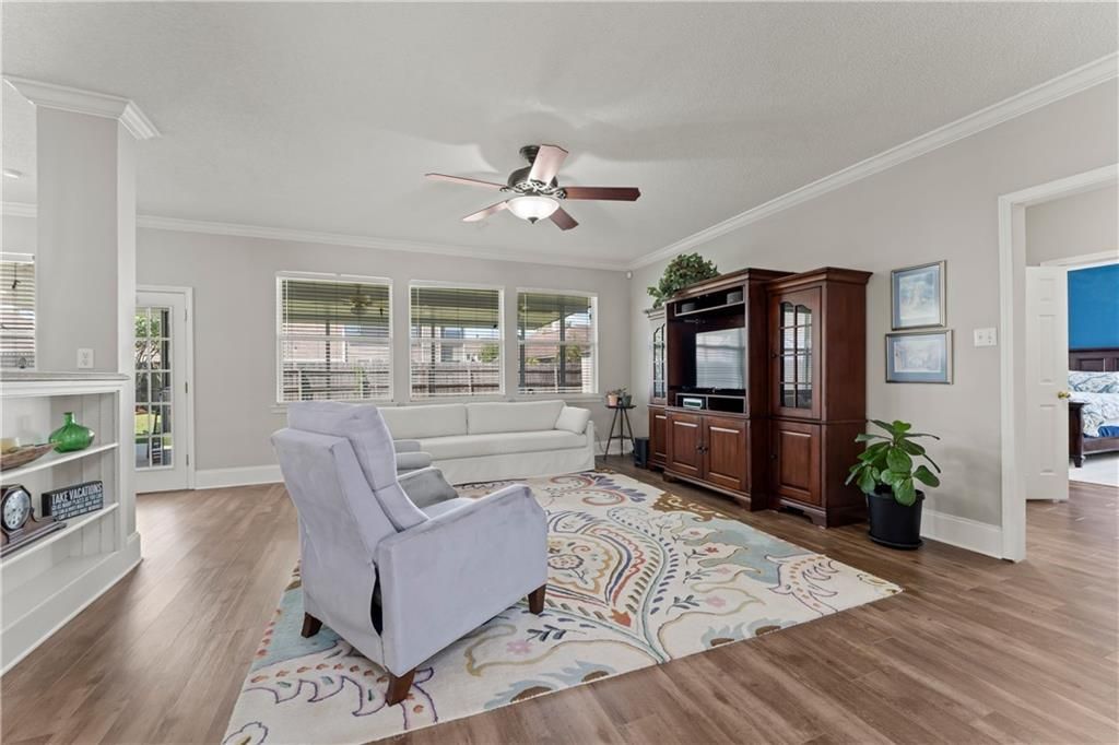 This charming residence is nestled within the highly sought-after Sterling Oaks Sub-division. The beautiful two-story home is designed to provide comfort and convenience in every corner, making it perfect for both relaxation and entertainment. Upon entering, you are welcomed by the inviting warmth of wooden vinyl floors that gleam underfoot. The spacious layout is enhanced by elegant crown molding and has been freshly painted, providing a clean canvas for your personal style to shine. The heart of the home is the well-appointed kitchen, featuring gleaming Quartz countertops with a tiled backsplash, modern appliances, and ample cabinet space?ideal for culinary creations. Casual meals can be enjoyed at the kitchen table, while more formal dining takes place in the adjacent dining area. The cozy living room, bathed in natural light from large windows overlooking well-groomed gardens, offers a perfect space to gather with loved ones. The primary suite boasts a tray ceiling and a custom-designed closet. The primary bathroom features marble tile, a garden tub with a separate shower, and a single vanity, creating a tranquil oasis for relaxation and rejuvenation. Upstairs, you'll find a peaceful retreat in three generously sized bedrooms. Each bedroom offers durable carpet, ample closet space, and plenty of room to unwind after a long day. Outside, an extended covered patio invites you to enjoy outdoor gatherings, gardening, or simply soaking up the sunshine. The property also includes a shed for all necessary tools. This home truly offers the best of both indoor and outdoor living. Residents will enjoy the tranquility of suburban living while being just minutes away from shopping, dining, parks, and top-rated schools. Additional features include an installed alarm system, double car garage and flood insurance is optional.