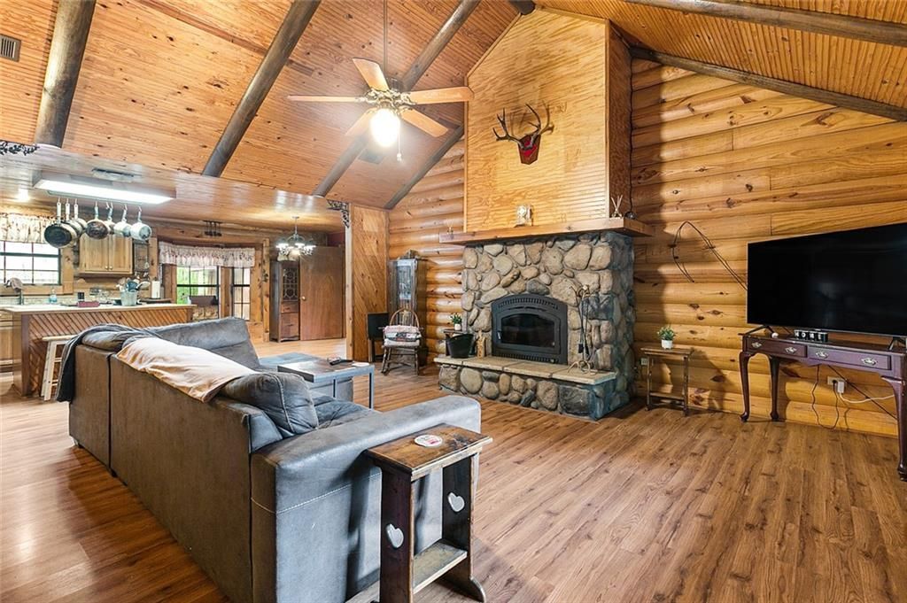 Welcome to your dream rustic retreat! Nestled on a serene 1.25-acre lot, this unique log cabin offers an idyllic escape with a perfect blend of modern comforts and natural beauty. As you drive up the charming circle driveway, you'll be captivated by the inviting front and back porches, ideal for lounging and enjoying the peaceful surroundings. Crafted from all pine wood logs complemented by elegant cedar trim, this home exudes warmth and character. The spacious interior boasts a thoughtful open floor plan, featuring high ceilings in the living room that create an airy atmosphere, further enhanced by a stunning stone fireplace that adds a cozy touch. The kitchen and dining area are beautifully enhanced by a picturesque bay window, flooding the space with natural light. With three cozy bedrooms and two well-appointed bathrooms, this cabin ensures comfort for family and guests alike. The generous laundry room and pantry offer convenience, while the attic presents an exciting opportunity to transform it into a loft or second story. Two sheds on the property provide ample storage or workshop potential. This enchanting log cabin is a rare find, ready to welcome you home! Flood insurance under $1,500!!