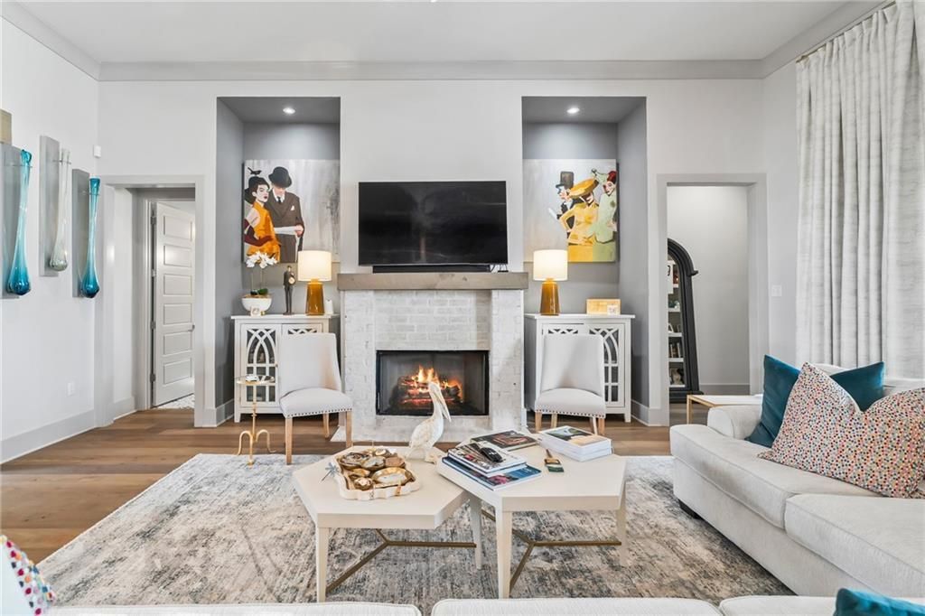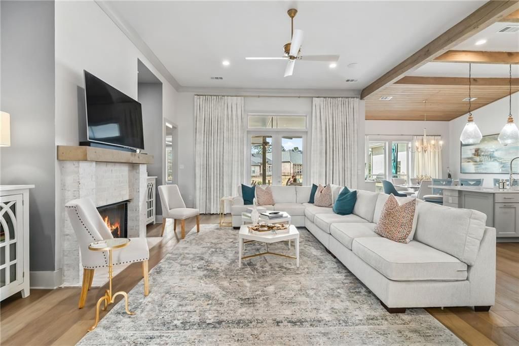 Situated within the gated, high-demand community of Maison du Lac, this waterfront residence blends refined coastal design with thoughtful architecture and exceptional livability on an oversized cul-de-sac lot with tranquil water views, the property offers privacy, a peaceful setting, and strong curb appeal. Inside, a combination of cathedral, vaulted, coffered, and tray ceilings?paired with exposed wood beams, custom archways, & shiplap accents. The light-filled living area is anchored by a gas brick fireplace & framed by expansive windows overlooking the water, while wide-plank flooring and designer finishes add warmth and sophistication throughout. The kitchen features custom cabinetry with built-in organization, a statement vent hood, artisan tile backsplash, quartz countertops, an oversized island, walk-in pantry, and an adjacent wet bar that seamlessly connects the kitchen, dining, and living spaces. A distinctive Bourbon Room provides additional flexibility as a lounge, office, or entertaining space. The thoughtfully designed floor plan offers separation between living areas and bedrooms, allowing for a range of uses including guest accommodations, workspace, or additional privacy. The home includes 5 bedrooms and 3.5 bathrooms, with two private en-suite bedrooms, two bedrooms connected by a Jack-and-Jill bath, and a spacious second-floor suite with a half bath that can function as a 5th bedroom, bonus room, or media space. The primary suite features a spa-inspired bath with dual vanities, soaking tub, glass-enclosed shower, & custom tilework. Outdoor living is equally well-appointed, with a large covered patio, surround sound, & a fully equipped outdoor kitchen overlooking serene waterfront views. A stocked lake with fountains enhances the setting. Additional features include a whole-house generator, plantation shutters, & seasonal exterior accent lighting. Enjoy waterfront living within one of Covington's most desirable gated communities