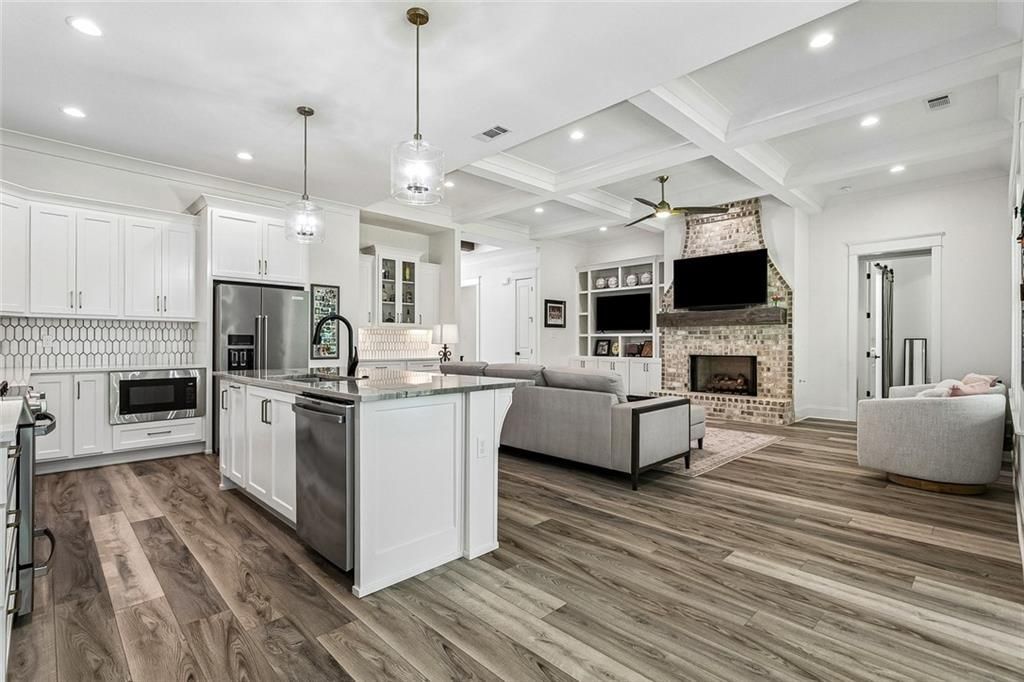 Set on an oversized lot in the highly desirable Madison Ridge Estates, this spectacular 2.5-year-old home stands out for its thoughtful design and stylish finishes. The living area with coffered 11-foot ceilings, a brick-accented gas fireplace, dry bar, and great natural light will take your breath away. The incredible kitchen featuring a quartzite island, custom cabinetry, a fabulous walk-in pantry, and high-end appliances will inspire your inner chef! Gather family and friends in the marvelous dining room overlooking the tremendous backyard. Barbecue and watch the games on the lovely covered back porch! Designer lighting and wood beam accents add to the superb sophistication of this home. The bathrooms throughout have a sleek, polished look, and having a mudroom is a huge plus. A whole-house generator is already in place (24kw Honeywell Guardian w/ 200 Amp Auto Transfer Switch)! The oversized attached two-car garage provides extra room for storage or larger vehicles. Madison Ridge Estates is known for its spacious lots, well-kept homes, and easy access to the Causeway Bridge. The Tchefuncte River is just minutes away, offering scenic boating, fishing, and waterfront dining. Nearby are Anytime Fitness, Abita Roasting Company, Keith Young's Steakhouse, The Anchor, and other convenient options for dining and shopping.