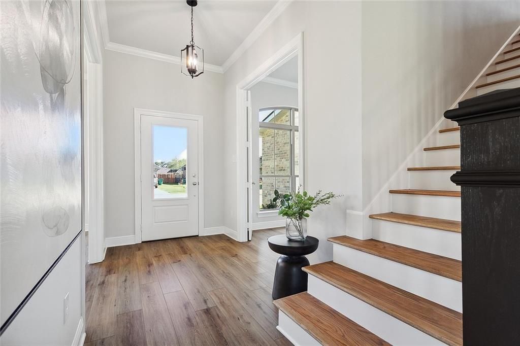Beautiful new two-story home featuring 4 bedrooms and 3.5 bathrooms, including a Jack and Jill design and a downstairs primary suite. The open-concept layout includes a gourmet kitchen with maple cabinetry and matte black finishes, flowing into a spacious living and breakfast area. A flex room/office space offers added versatility. Enjoy a covered patio on a .5-acre homesite overlooking a 1/2-mile paved community walking trail. Includes a two-car garage and energy-efficient features, tankless gas water heater, gas appliances, and quartz countertops, all near schools, parks and shopping.