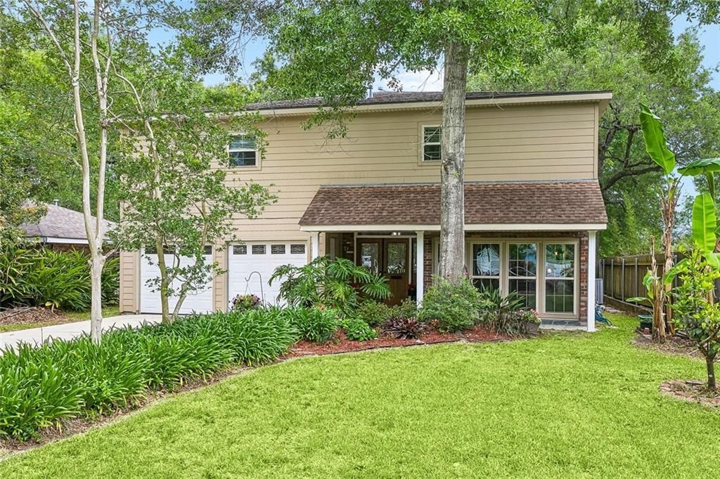 Home with a VIEW!! Backyard with stunning views of the Greenspace (formerly known as the Colonial Golf & Country Club) Second story living "WOWS" you as you walk up the interior staircase when you are greeted with a wall of windows overlooking the huge backyard that opens into the Park-like setting. Enjoy the open & easy flow of the light filled living space of the Dining room, Den, Breakfast Area & Kitchen boasting gleaming wood floors & beamed ceilings throughout-Den has a beautiful brick wood burning fireplace with built-ins on one side. Every room in this space will have you in AWE of the view! Enjoy beautiful sunrises or afternoon birdsong & wildlife from the upper deck off the breakfast area. Upper level boasts 4 bedrooms & 2 baths. There is a generous sized Living space located on the lower level that includes a family room, 1.5 baths & kitchenette "area" & the 5th bedroom. Roof replaced 2021, Updated Kitchen & Baths...Flood Zone X! See attached list of Amenities in MLS.